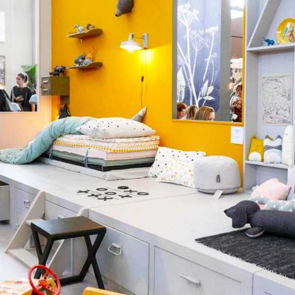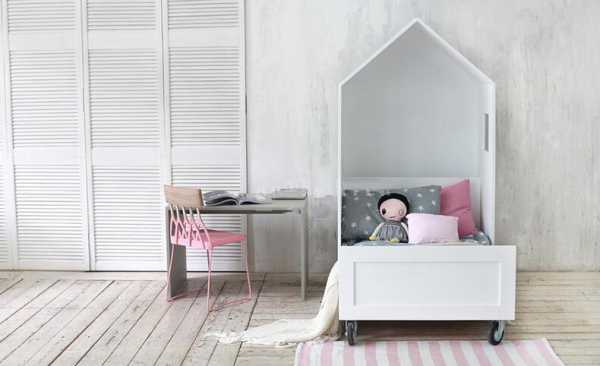 Используйте «элементы норки», чтобы ребенок чувствовал себя защищенным. Вы обращали внимание на то, что собаки любят прятаться или сидеть под креслами или под столом? У них хорошо развиты инстинкты, и они знают, что делают: именно в таких местах питомцы чувствуют себя наименее уязвимыми и там им крепко спится. Такой же подход применим и к детям. Например, в своей коллекции мы использовали домики в изголовье кровати — это не только декорация, но еще и залог сна без тревог.