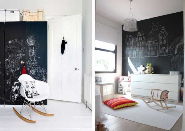 Другой вариант – окрасить одну из стен специальной грифельной краской черного цвета, дать детям в руки белый мелок, пригласить изобразить на ней любимых сказочных персонажей, дома. Рисунки можно будет стирать и наносить снова – детишки от этого в восторге. Благодаря этой хитрости мы убережем от разукрашивания светлые стены и мебель как в самой детской, так и в других комнатах. Белая вагонка тоже как нельзя лучше подходит для того, чтобы выделить одну из стен. Ей также можно обить внутреннюю сторону двери.
