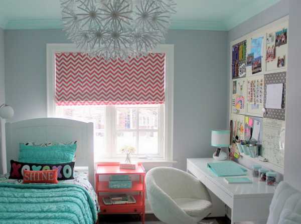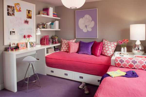 Оформление детской комнаты для подростка во многом зависит от цветового решения. Для девочек-подростков прекрасно пойдет комната в бежевых, красных, сиреневых и фиолетовых оттенках. Для мальчиков того же возраста, помимо универсальных оттенков, можно сделать комнату в серых, песочных и пастельных тонах. Маленький секрет: если в комнату проникает недостаточно света, то интерьер в желтых тонах добавит комнате освещенности. Главное, избегать резких цветов и переходов, что может добавить комнате агрессивности и вызывать чувство страха и неудовлетворенности. И не забывайте, что чем светлее интерьер детской комнаты маленькой площади, тем просторней она кажется.