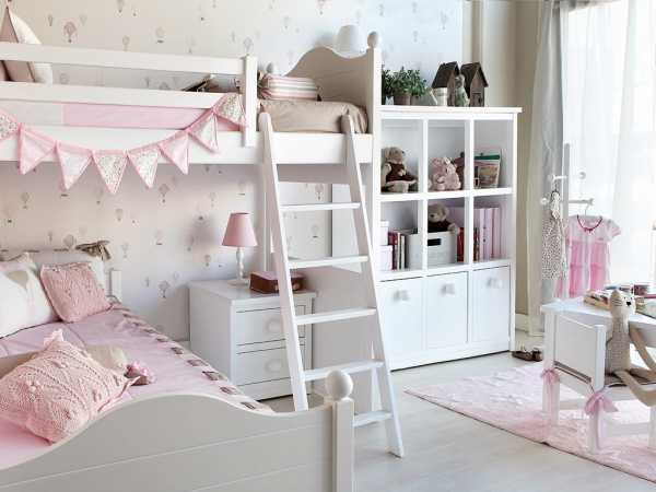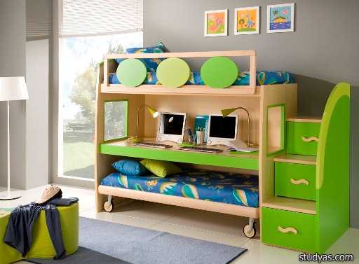 - Если на одной территории живут двое детей, ради экономии пространства установите двухъярусную кровать. Психологи не рекомендуют располагать спальные поверхности одну над другой, лучше купите кровать со смещенным верхним этажом, оснащенную надежной лесенкой и бортиками.