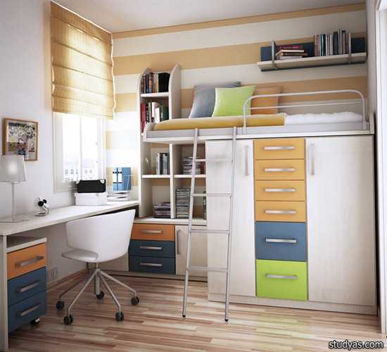 Интересная идея спального места, экономящая пространство в маленькой комнате: смонтируйте подиум, под который в дневное время будет задвигаться кровать. На возвышении можно расположить детскую спортивную площадку или поставить парту для рисования.