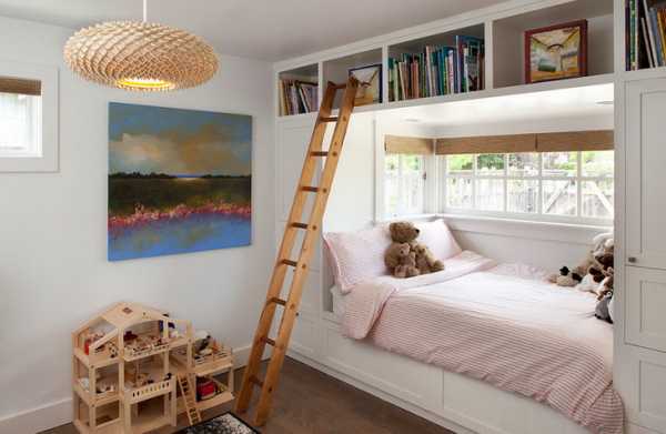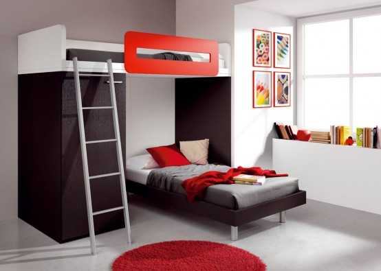 Установленные одна под другой – по типу полок в пассажирском поезде – кровати могут размещаться лишь в дальнем углу от окна – только в этом случае они визуально не заполнят комнату. Если их поставить ближе к окну или посередине стены, то зрительно они поглотят больше света и пространства, нежели сэкономят. Прошу вас, имейте в виду этот нюанс. В маленьком помещении порой парадоксально правильнее поставить кровати друг к другу под углом, либо установить выкатные (если имеется место для выкатывания), нежели одну под другой.