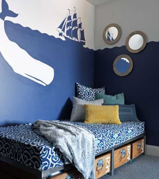 Оригинальные аппликации или трафареты на стенах и потолке избавят маленькую детскую от монотонности. Хозяин спальни с гордостью покажет гостям свои рисунки, оформленные в рамки. Интересно смотрятся фотообои с героями любимых мультфильмов.