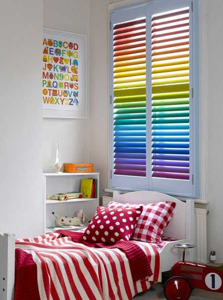 Ни одна детская не обходится без веселых и ярких штрихов оформления. Шторы – один из таких элементов. Чтобы не загромождать пространство, оживите его египетскими или римскими занавесками с ярким принтом. Актуальная идея – рольставни или жалюзи.