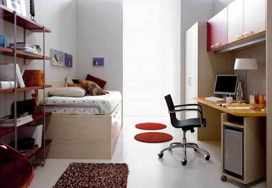 Многофункциональная мебель для детскойПод этим определением подразумеваются предметы мебели, которые могут выполнять сразу несколько функций. Приведём пример. Подростковая кровать может собираться и превращаться в уютное кресло, на котором ваш непоседа может в течение дня сидеть, читая интересную книгу или смотря телевизор. Мобильная тумба на колёсиках в течение дня служащая отделением письменного стола для хранения канцтоваров и других ученических принадлежностей, вечером легко превратить в подставку для ночника или журнальный столик. Чтобы не загромождать комнату множеством стульев для друзей вашего малыша, используйте для этих целей диванные подушки. Можете смастерить их самостоятельно или же приобрести в магазине. Они должны быть объёмными и мягкими, чтобы дети могли сесть на них, уложив их на пол.