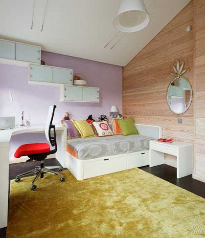На рабочем столе необходимо учесть место для компьютера, а также полноценное свободное пространство для выполнения домашних заданий. Модель дивана или кровати лучше выбрать со специальными выдвижными ящиками для хранения.