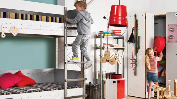 Идеальна двухъярусная кровать, шкаф с равным числом полочек для каждого ребенка. Столешница большого размера решит проблему рабочей зоны.