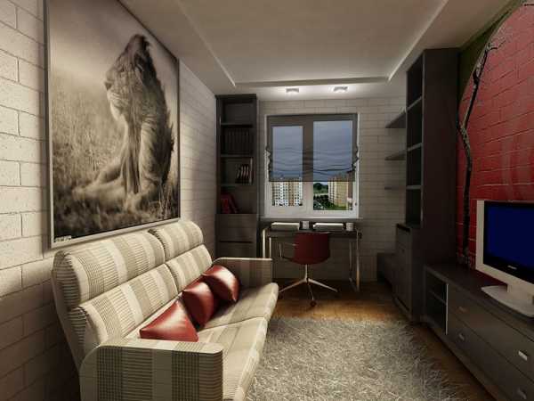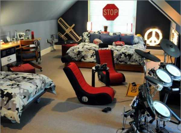 Для организации зоны отдыха используются кресла или небольшой диванчик, позволяющие разместить гостей. Здесь же можно расположить технику, игровые приставки и повесить стеллажи для книг и памятных предметов.
