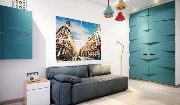 Яркий и стильный штрих в минималистичном стиле можно сделать, оформив одну из стен в цвете, отличающемся от основной гаммы помещения. Также хороший вариант — фотообои.