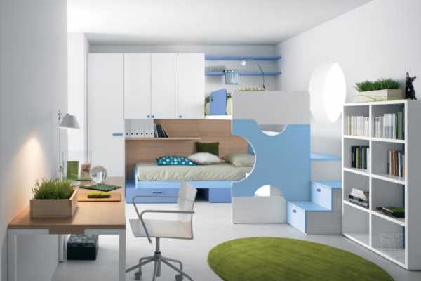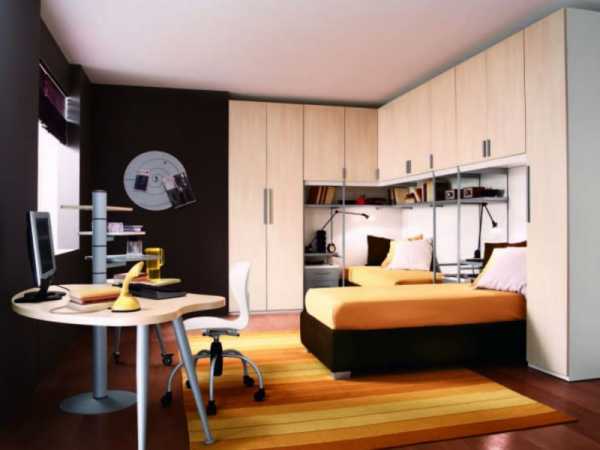 Если комната для подростка маленькая, тогда объедините в ней «рабочие» зоны. Например, в зоне сна – поставьте двухъярусную кровать, шкаф для вещей условно поделите поровну, а в качестве рабочей зоны сделайте одну большую столешницу.