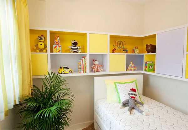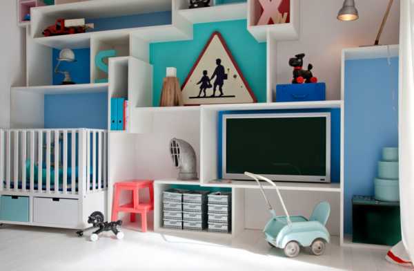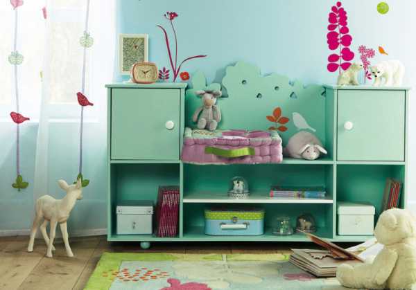 Поскольку в комнате ребенка эта задача практически невыполнима, дизайнеры рекомендуют обустроить помещение всевозможными декоративными шкафчиками для игрушек, сундуками, скрытыми полками и т.д.