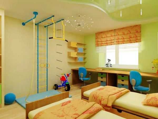 Угловое пространство детской комнаты можно задействовать, поставив в этом месте небольшой узкий шкаф с полками. Для ребенка постарше предпочтителен вариант со шведской стенкой.