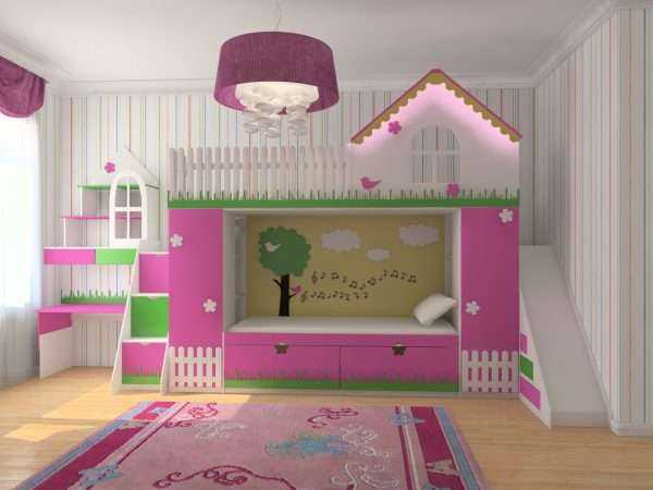 Такое распределение площади позволит с детства приучить ребенка к разделению сфер деятельности. К тому же это повышает самодисциплину ребенка. Если площадь комнаты небольшая, то рационально рассмотреть многоярусные конструкции. На верхнем ярусе располагается спальное место ребенка, а под ним организована игровая. Такие идеи обычно приходятся по душе девочкам. Такая конструкция очень напоминает домик, а если приложить некоторые усилия и проявить фантазий, то нижний ярус можно сделать настоящим домом, в котором понравится играть любой малышке. Другой вариант двухъярусной конструкции предполагает размещение в нижнем ярусе шкафов для одежды, а на верхнем спального места. Этот вариант тоже удобен для ребенка, так как всего вещи находятся в зоне досягаемости, и девочка всегда может сама убирать свои вещи по местам, а также выбирать себе гардероб на завтра. Такое совмещение зон экономит пространство и позволяет максимально задействовать всю площадь комнаты. Фото вариантов двухярусных модулей смотрите ниже.