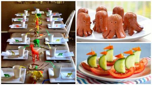 В качестве украшений обеденного стола могут использоваться не только красивые стаканы, тарелки и вазы. Еда тоже вполне может играть эту роль: торты из мастики, разноцветные капкейки, салаты, выложенные в форме зверушек, украсят стол не хуже старинного бабушкиного сервиза.