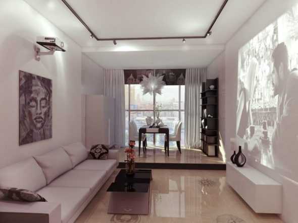 В этом помещении обычно принимают гостей. Поэтому важно обустроить ее именно так, чтобы Вы могли комфортно размещать максимальное количество человек. В случае, если помещение совсем маленькое, корпусная мебель поместится проблематично, поэтому поставить лучше пару мягких кресел или стандартный набор из дивана и одного или двух кресел и/или пуфика.