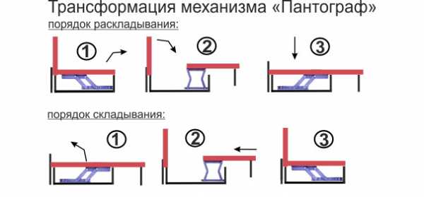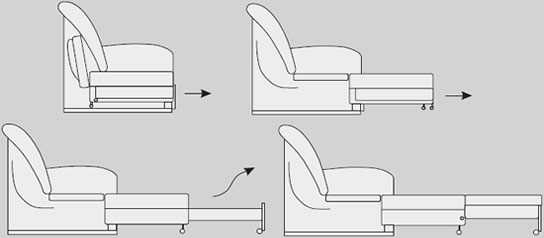 - Пантограф – разновидность еврокнижки, но при выдвигании потребуется дополнительно приподнять сидение и самостоятельно опустить спинку в нишу. Преимуществом подобной конструкции является отсутствие контакта ножек (роликов) с полом, что предотвращает появление царапин на напольном покрытии.