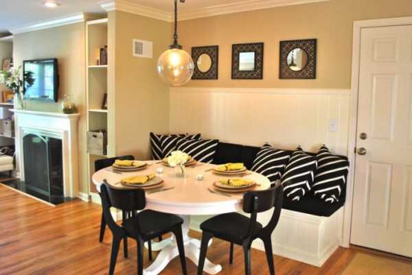 - уровень комфорта обеденной зоны повышается в разы, если вместо обычных стульев можно будет присесть на мягкий диван;