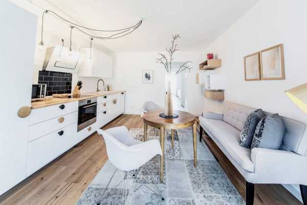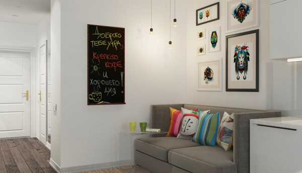 - из кухни можно сделать гостиную, если повесить на стену напротив дивана телевизор или монитор. В однокомнатной квартире с большой кухней таким образом можно решить проблему выделения под спальню целой комнаты.
