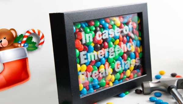 Для изготовления шуточного панно потребуется спец-рама со стеклом для объемных работ, немного краски и много сладостей. Великолепно в этой роли будут смотреться драже «M&M’s» или «Skittles», благодаря их яркому цвету и устойчивости к жаре. Нужно написать на стекле через трафарет: «В случае опасности — разбить стекло» и заполнить раму конфетами.