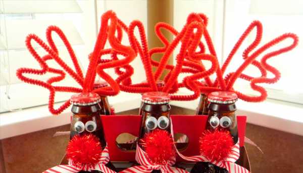 Еще один hand-made презент, который очень просто и быстро сделать, особенно в случае, если нужно большое количество подарков — это Рождественские олени — бутылки. Подарить их можно и детям (бутылки с «Coca-Cola» или другой газировкой), и взрослым (бутылки пива).