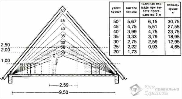 Зависимость высоты потолка мансарды и угла скатов крыши