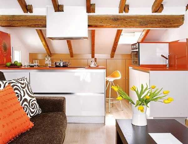 И, наконец, отличный пример того, как в мансардном помещении может находиться целая квартира, в которой, несмотря на скошенную крышу, все чувствуют себя вполне комфортно. Спроектированный дизайн мансарды специально для этой квартиры, встроенные полки и шкафы по удобству не намного уступают обычным, но зато как красиво и уютно смотрится в гостиной скошенный свод с деревянными балками теплого медового цвета.