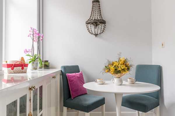 Идеально подойдет П-образный или параллельный кухонный гарнитур, выкрашенный в светлые оттенки, но более компактные модели тоже будут смотреться уместно. Чтобы не перегрузить интерьер декором, можно приобрести несколько шкафов с застекленными фасадами, демонстрирующими красивый сервиз. Если площадь позволяет, следует выделить для столовой отдельную комнату.