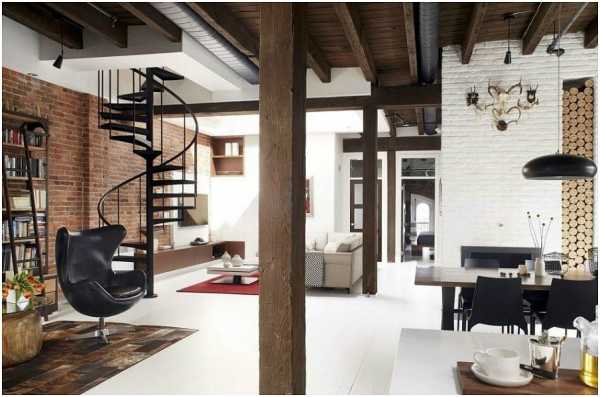 Деревянные колонны и балки превосходно сочетаются с кирпичными стенами