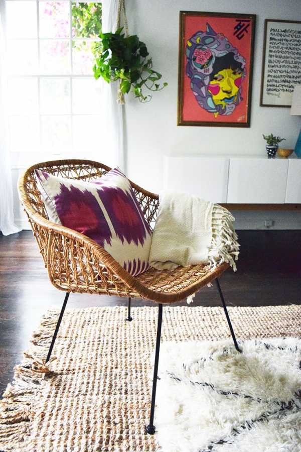 Чтобы сделать кресло частью интерьера, его можно просто грамотно декорировать. Для этого подойдут подушки и пледы, если их чехлы будут сшиты из материала штор или оттенка на стенах, то они легко включат его в общую картину.