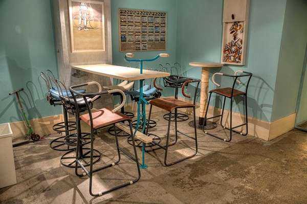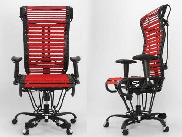 Чтобы офисные сотрудники долго не засиживались без физической активности, конструкторы предложили кресло-тренажер. Спинка выполнена из эластичных полосок, которые обеспечивают эргономичность. За спинкой и по бокам кресла крепятся эспандеры, с помощью них удобно тренировать руки и спину.