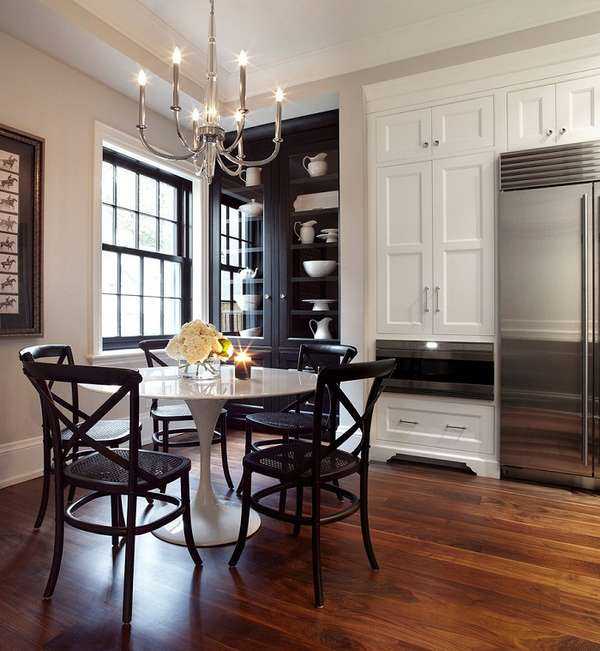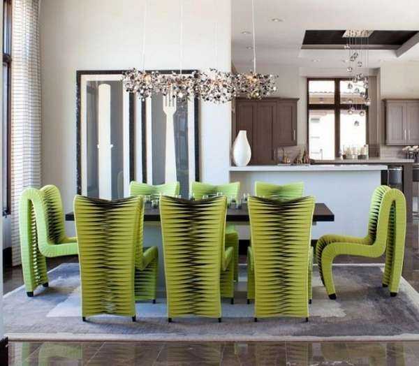 Когда площадь жилья позволяет — лучше отделить все же обеденную зону и организовать столовую. Дизайнерские столы и стулья должны соответствовать стилю оформления помещения, от этого будет зависеть выбор материала мебели, цветовой палитры и формы конструкции. Например, дизайнерские обеденные стулья в классическом стиле будут изготовлены из ценных сортов древесины, могут иметь декоративные элементы, такие как резьба или позолота. Более утонченные и изгибистые элементы мебели присутствуют в модерне. В современном минимализме отлично будут смотреться стулья для столовой дизайнерские, сделанные из пластика и металла, а для романтического направления прованс стоит остановить выбор на плетеной мебели.