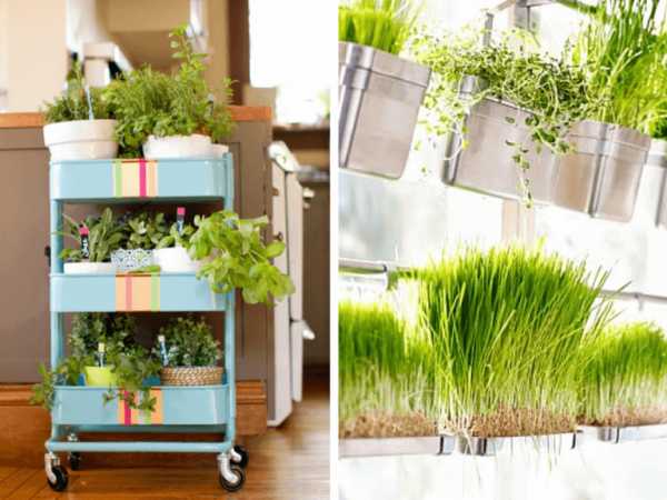 Более традиционным декором являются многочисленные цветы в глиняных и стеклянных горшках, на целых полках, возможно, даже на всю стену. Практичным украшением кухни станет домашний огород. Используя специальные сорта комнатных растений, дома можно вырастить и зелень, и овощи.