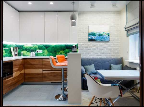 Отделка стен может быть выполнена экономно: достаточно просто покрасить или же оклеить кухню обоями. Можно выбрать пробковое покрытие, деревянные панели. Гармонично и естественно будет смотреться отделка стен и их отдельных участков морской галькой, глиняной плиткой, стеклянной мозаикой. Таким образом можно выложить границы гостиной, совмещенной с кухней, и углы помещения.
