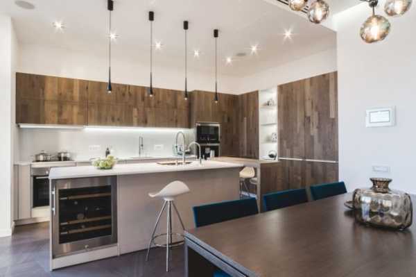Фужеры, бокалы для вина, стеклянную посуду можно установить на настенных полках, центр кухни заполнить несколькими светильниками.