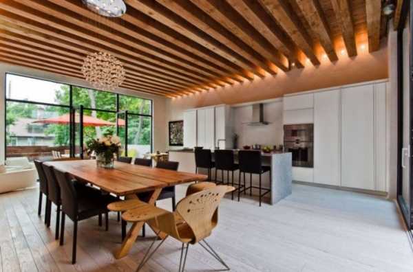 Наиболее выразительный вариант потолка оформляют с использованием выступающих фальшбалок потолочного перекрытия, как это применяется в деревянных домах в стиле шале.