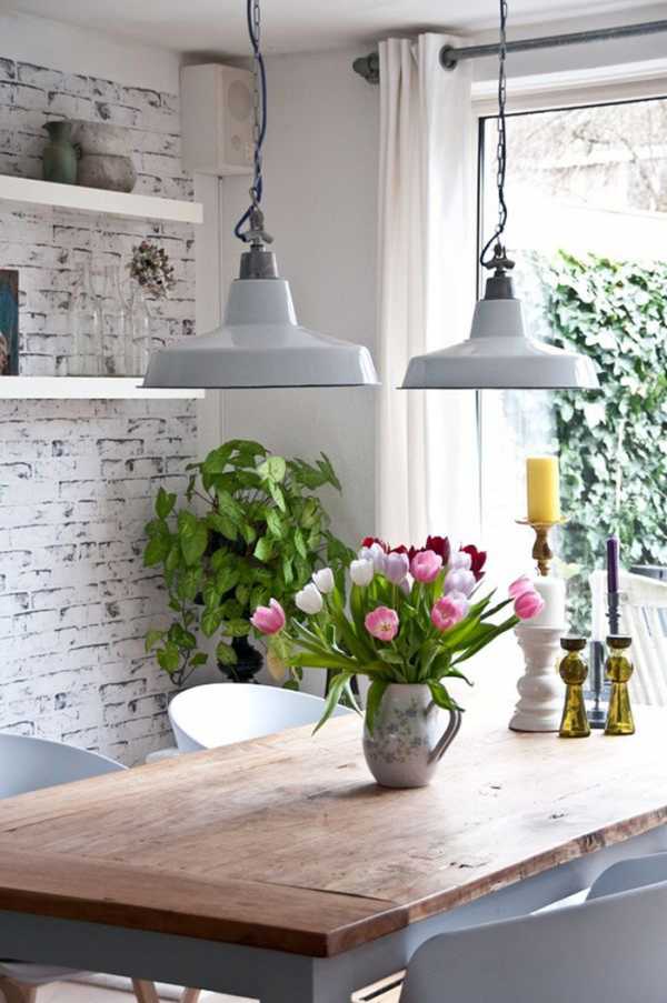 Ложный камин, выложенный из белых, серых, красных кирпичей, станет изюминкой столовой.