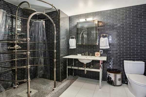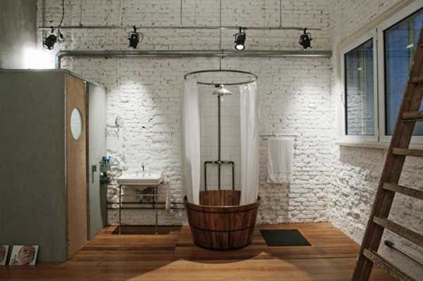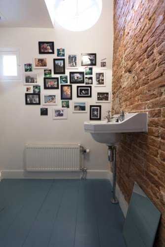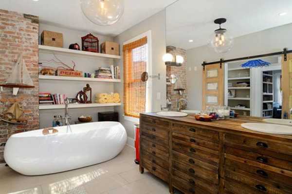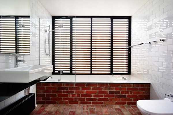 В ванных комнатах и туалетах кирпич также можно применять – никаких ограничений нет, материал выдерживает и повышенную температуру, и влажность. Кирпичной кладкой выделяют различные зоны в помещении, или разделяют их перегородками.