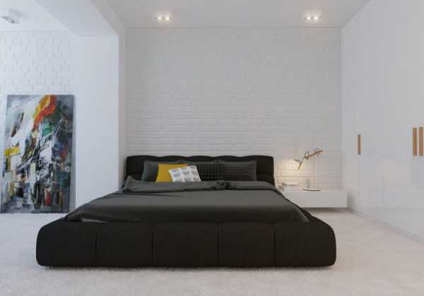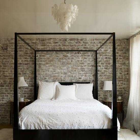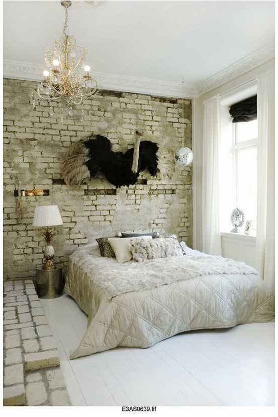Классическая спальня смотрится совершенном в новом ракурсе при соседстве брутальной кладки и мягкого текстиля. Белый кирпич в интерьере современной спальне, покрытый лаком, выглядит мягким, приятным на ощупь.