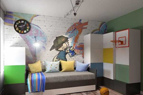 - Рисунки на кирпичной стене в стиле граффити станут ярким акцентом в комнате для детей и подростков.