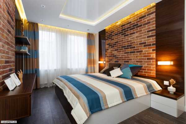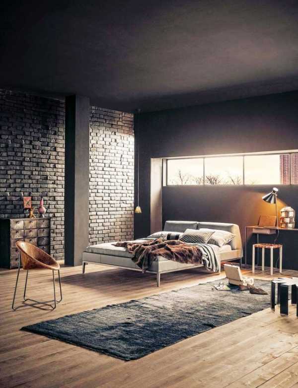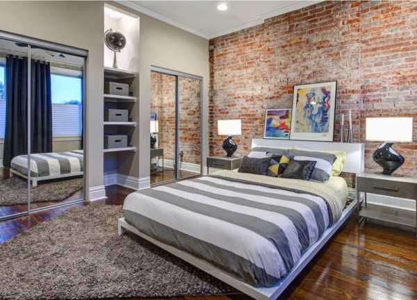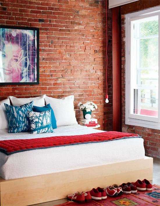 Здесь кирпич используют чаще всего для отделки стены у изголовья постели, подчеркивая фактурой ее особое значение в интерьере. Еще один популярный вариант – акцентировать кладкой стену с окном. В небольших помещениях лучше отдать под кирпич не всю стену целиком, а лишь ее часть, чтобы не утяжелять восприятие пространства.