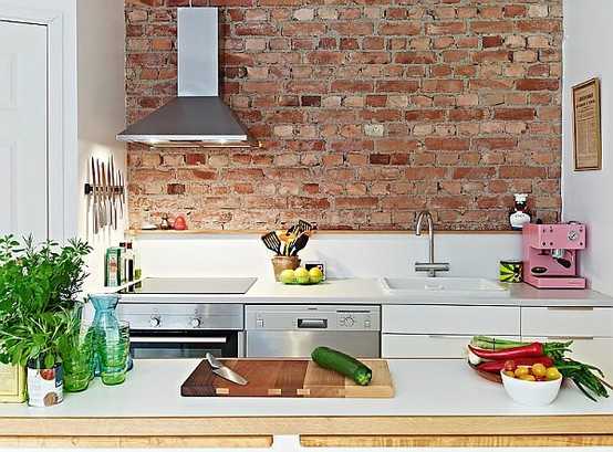 Чаще всего на кухне кирпичная кладка служит «фартуком» возле рабочей поверхности. Здесь применяют, как правило, декоративный кирпич, обладающий специальными характеристиками и гладкой поверхностью, что облегчает уборку.