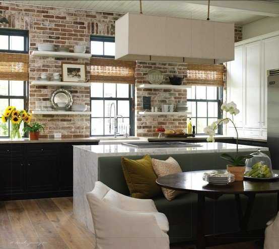 Для кухни подходят кирпичи различной расцветки, главное, чтобы он гармонировал с мебелью, занавесками.