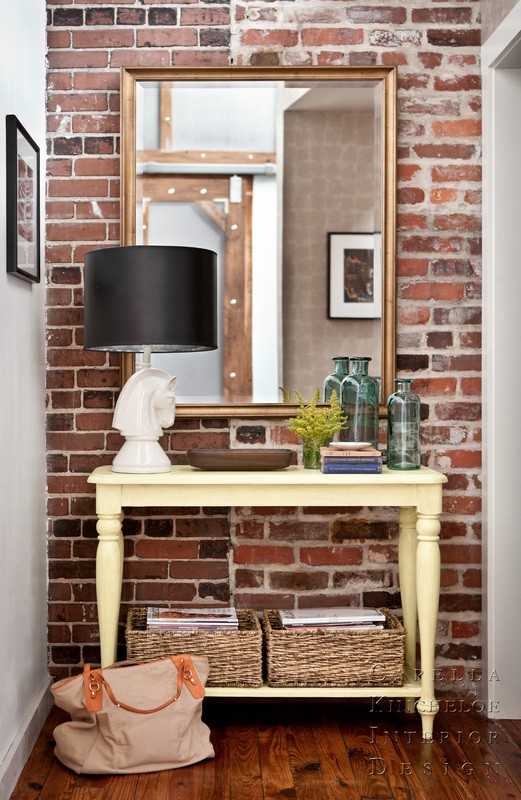 Здесь кирпичная кладка поможет отделить входную зону от остальных, либо богатой кирпичной фактурой на стенах, либо отдельно стоящей перегородкой из кирпичей, если позволяет площадь. Можно оформить кладкой участок стены в прихожей, отведенный под вешалку для одежды, тем самым выделив ее в отдельную зону. Эффектно смотрятся возле кирпичной стены столики-консоли для перчаток и прочих мелочей, над которыми вешают большое зеркало.
