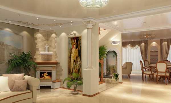 Античный стиль интерьера подразумевает наличие колон, лепнины и здесь просто необходима кирпичная кладка для отделки дверных проемов, пространства вокруг камина.