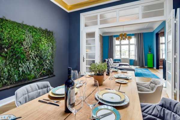 Оригинальный дизайн квартиры выполнен в ярких тонах. В отделке стен применяется кирпичная кладка, покраска, обои, мозаика, и даже зелень живых растений. Комбинация расцветок и фактур выбрана так, что все это многообразие отлично сочетается и формирует гармоничный и уютный интерьер.