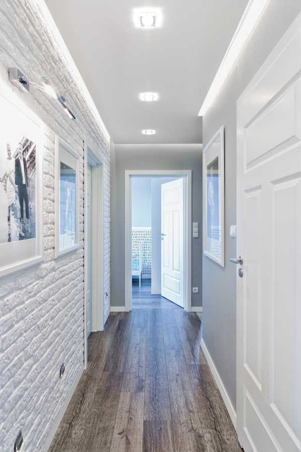 На фото кирпичная стена в прихожей в интерьере студии 56 кв. м.