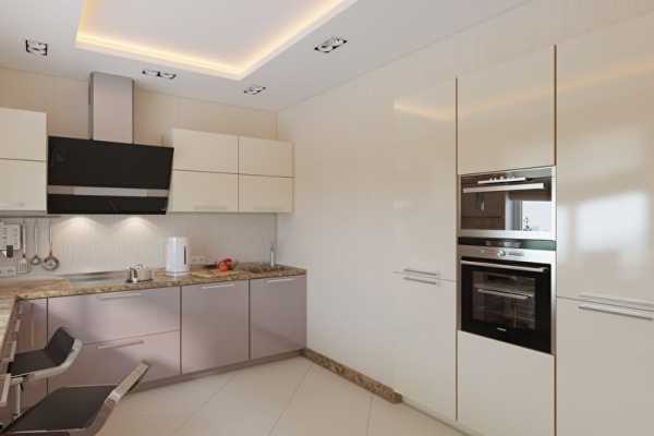 Оптимальный вариант оформления потолка в маленькой кухне — светлая натяжная пленка или же простое окрашивание. Выровнять поверхность, а также избежать микротрещин на штукатурке поможет стекловолокно.