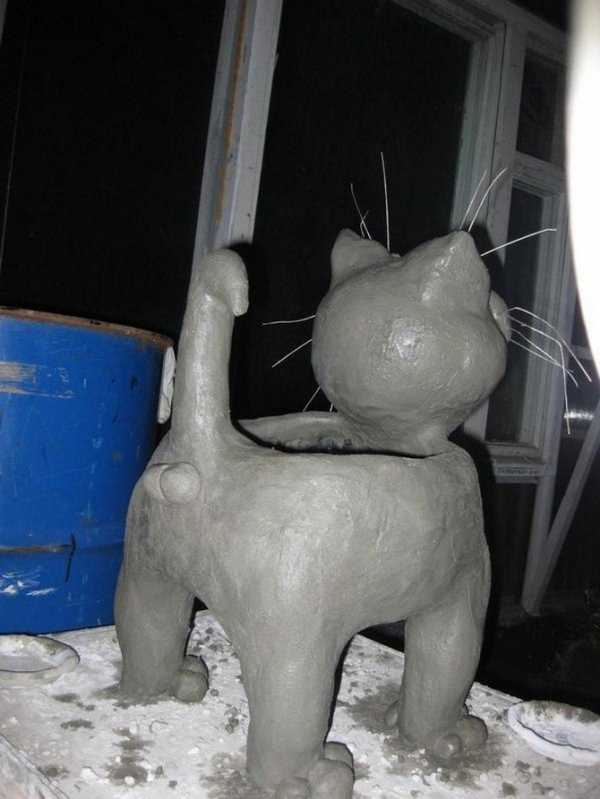 Для усов и бровей нарежьте толстую проволоку разной длины и установите их в ещё влажную поверхность. Зашлифуйте всю фигурку влажными руками и оставьте котика на полную просушку в течении 3-4 дней. На период сушки горшок лучше накрыть полиэтиленом. После высушивания отполируйте котика наждачной бумагой. Раскрасьте кота и покройте двумя слоями лака.