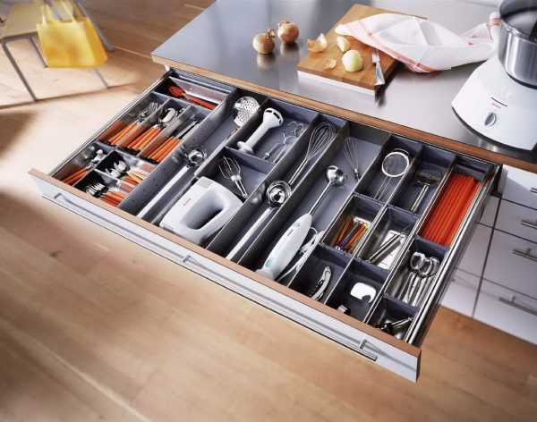 Если ваша кухня организована оптимально, то все предметы на ней будут иметь свое место, а все мелочи аккуратно расставятся по полочкам и ящикам. Согласитесь, такая организация – мечта любой хозяйки. Чтобы помочь ей в исполнении ежедневных рутинных обязанностей на кухне и превратить обычную готовку в увлекательный процесс, следует подойти к организации пространства на кухне с фантазией. Ведь согласитесь: когда вы поглощены творческим процессом приготовления пищи, нет времени искать, где лежат ложки, а где вилки. Поэтому целесообразно предусмотреть специальный лоток для столовых приборов. При этом можно выбрать вариант, который наиболее подходит вашему бюджету.