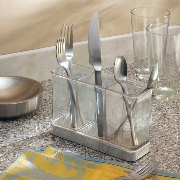 Конечно, для хранения приборов подойдет и самая простая банка или корзинка, но ее минус в отсутствии внутренних разделительных перегородок. Если вы поставите в одну емкость вилки и ложки, они быстро перемешаются, а ставить отдельную банку для каждого вида приборов значит неэкономно расходовать место.